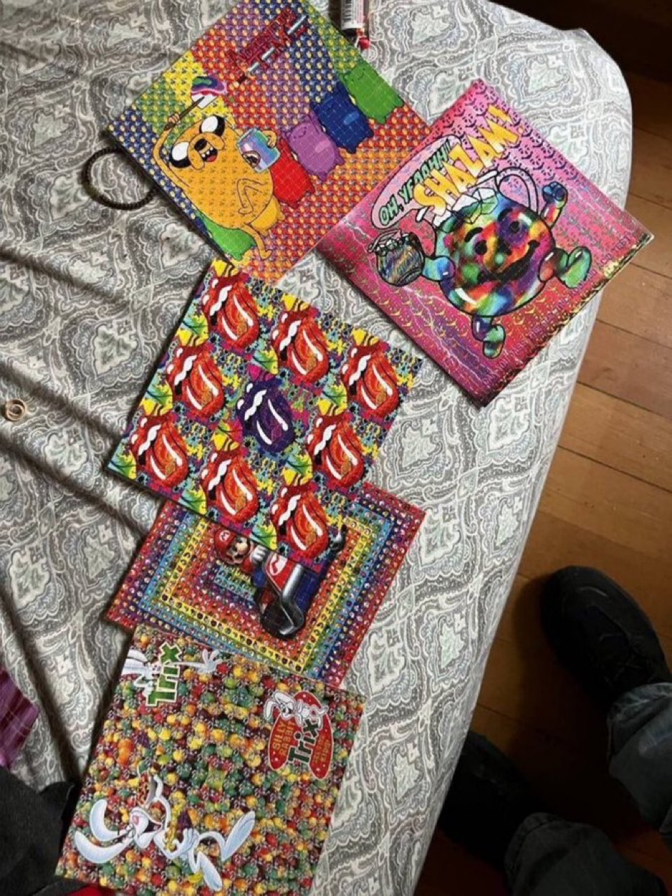LSD is usually sold as small squares of paper with pictures on them, known as tabs or blotters.